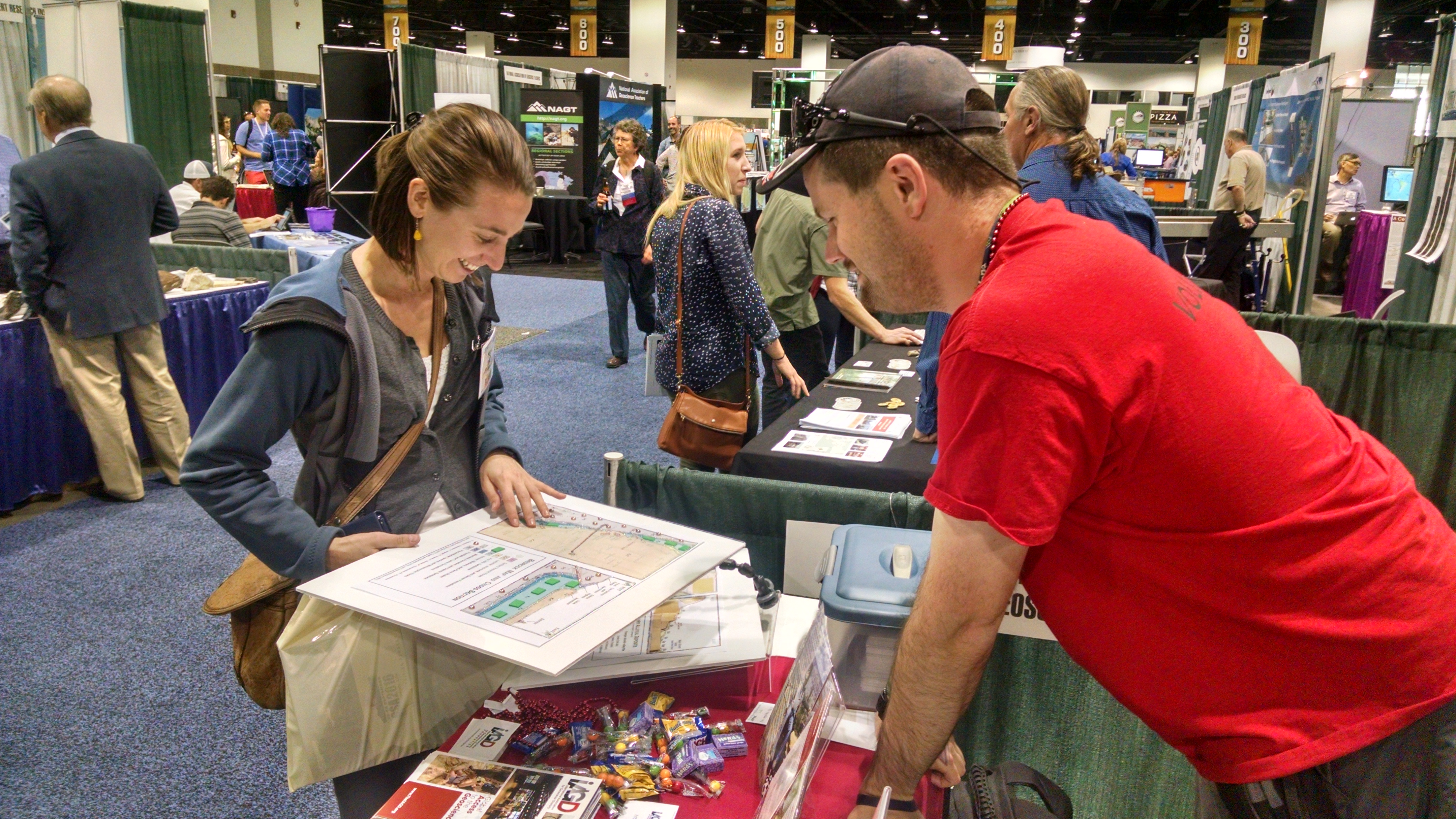 Cole shows a map to a conference attendee at the IAGD booth in the expo hall.