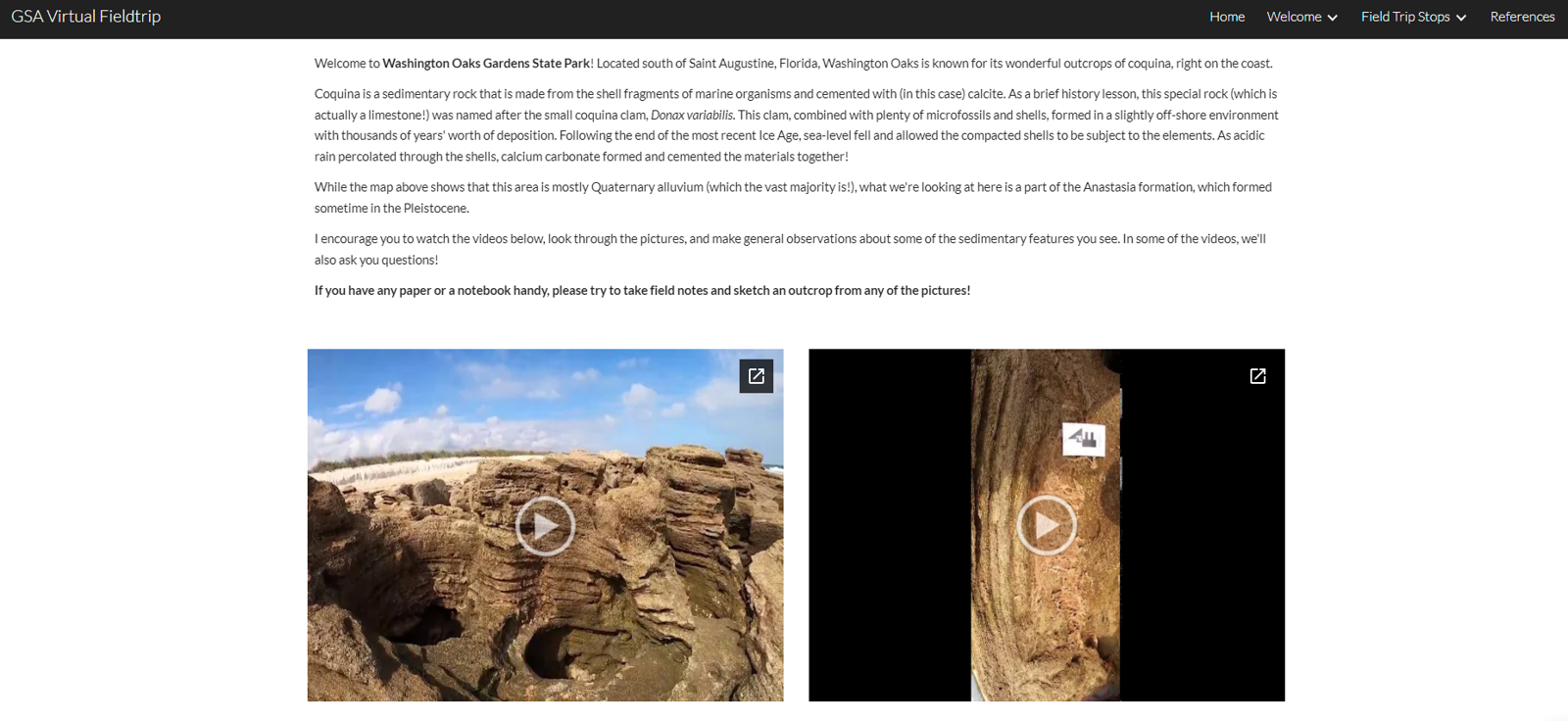 This virtual field trip site was created by undergraduate students at the University of Florida Using camera and iPad equipment from the LIFT kit: An Undergraduate’s First Field Experience. Clicking on the screenshot below will take you to a great example page of how the student used the GoPros and other equipment to create a virtual field stop.